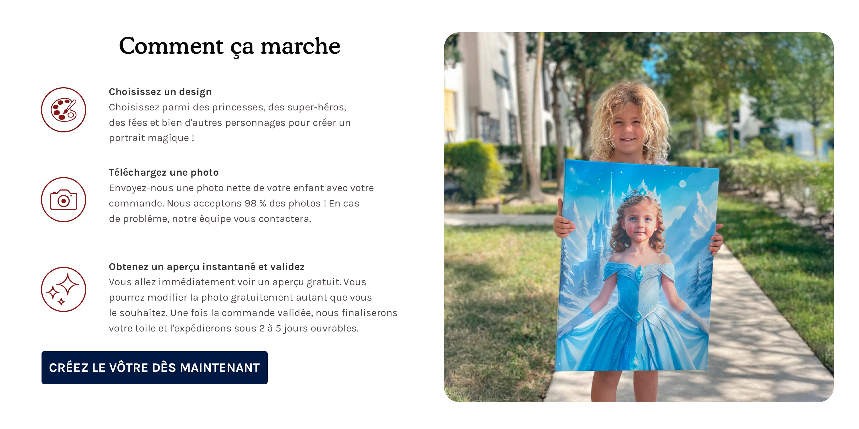 « Ma fille n’arrête pas de sourire devant son portrait de princesse. En plus, la livraison a été super rapide ! » — Sophie L., Lyon